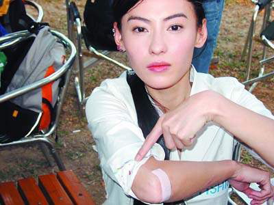 張柏芝在拍廣告時不改其貪玩的個性,與古天樂打鬧,還不慎擦傷玉臂。張柏芝很傷心地向記者展示她手臂上的傷痕說:“今天拍這個廣告主要是說我和古仔(古天樂)都是射擊好手,所以剛才在拍攝的空隙我就和他拿著手槍追逐互射,他斗不過我,就拿桌上的產品來擲我,我在左閃右避的時候手臂就碰到背景板,這些背景板都是用木制的,很粗糙,所以就刮傷了手,皮都掉了,當場流血。”