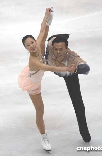 二零零四年十二月十七日,中國(guó)選手申雪/趙宏博在北京舉行的二零零四年世界花樣滑冰大獎(jiǎng)賽總決賽雙人滑短節(jié)目比賽中獲第一。作者:武仲林