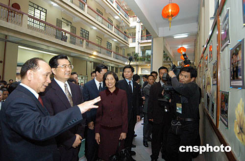 胡錦濤與夫人劉永清在澳門特首何厚鏵的陪同下參觀澳門勞工子弟學校,受到學校師生的熱烈歡迎。作者:梁永強