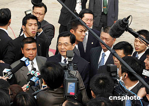 胡錦濤在澳門機場向記者發表講話。胡錦濤十九日上午抵達澳門國際機場,走下舷梯后隨即向前來采訪的記者發表了簡短的講話。作者:宗金柱