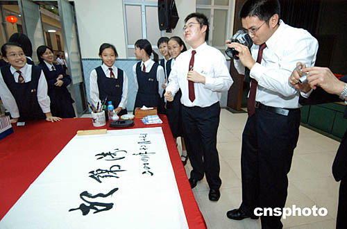 國(guó)家主席胡錦濤在參觀澳門勞工子弟學(xué)校時(shí)寫下了“胡錦濤”三字墨寶,引來學(xué)生爭(zhēng)相拍攝。