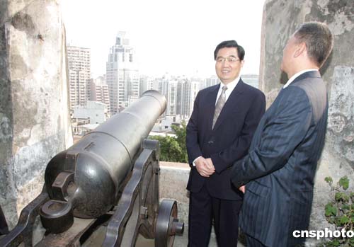 12月19日下午,首次到達澳門的胡錦濤主席饒有興趣地參觀了當地著名景點大炮臺。作者:宗金柱