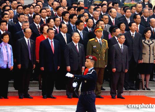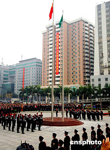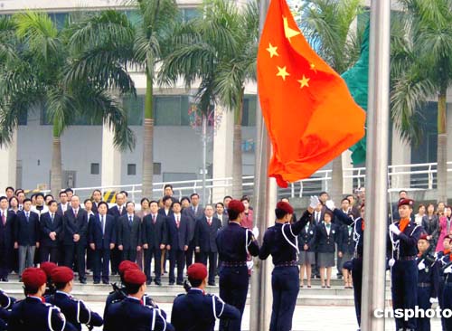 澳門特別行政區行政長官何厚鏵、解放軍駐澳門部隊司令員劉聯華20日上午出席莊嚴的升旗儀式,慶祝澳門回歸祖國五周年。作者:宋吉河