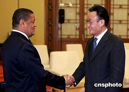 中新社北京十二月二十一日電(記者邢利宇)全國人大常委會委員長吳邦國今日下午在人民大會堂會見了埃塞俄比亞議會聯(lián)邦院議長穆拉圖一行。