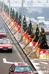 十二月二十四日,北京東三環農展橋兩邊立起了一百多棵圣誕樹,并在路旁裝點了彩色的塑料花,為節日增添了喜慶的氣氛。作者:韓藝冰