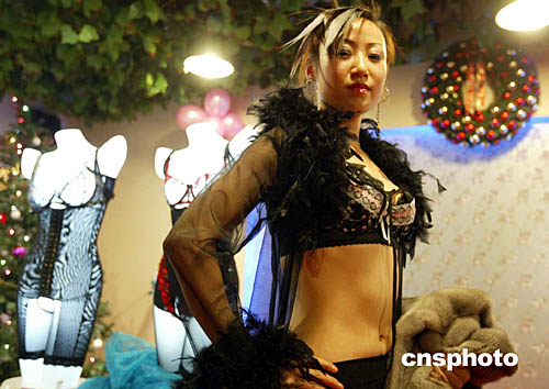 十二月二十五日圣誕節(jié),在北京寶兒金領(lǐng)生活館,一場(chǎng)別開生面的臺(tái)灣薇尼喬二零零五年新款內(nèi)衣秀為許多白領(lǐng)女性增添了生活樂趣。中新社記者:任海霞