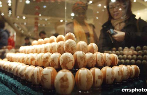 十二月二十六日,中外游人正在觀看用雞蛋殼雕刻出的《水滸》人物“一百單八將”。二十四日,北京民間藝術展開始在中華世紀壇舉行,同時展出的還有風箏、泥塑、面塑、毛猴、剪紙、蛋雕、京劇臉譜等二十多個藝術門類的二百八十件民間工藝品。作者:韓藝冰