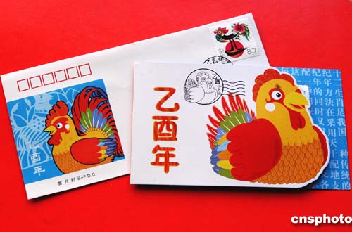 北京市郵票公司為配合國家郵政局于2005年1月5日發行《乙酉年》特種郵票(1套1枚),特設計印制了該郵票的首日封(左)、郵折(右)郵冊卡書等郵品,并將與郵票同日發行。《乙酉年》特種郵票面值人民幣80分,是中國發行的第三輪生肖郵票的第二套。在十二生肖排序中,雞象征著振奮和吉祥,故民俗中有“金雞報曉”和“金雞起舞”等說法。作者:鄒憲