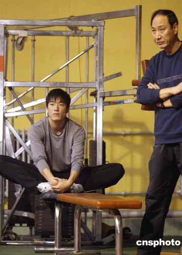 劉翔在教練指導(dǎo)下進行冬訓(xùn)