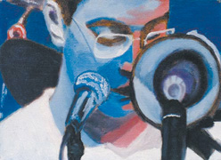竇唯還特別喜歡用畫描繪自己樂隊演出時的景象,在昨日曝光的作品中就有兩幅。從畫面上看,一組搖滾樂隊正在舞臺上盡情揮灑激情,而臺下的觀眾也投入欣賞。另外一幅自畫像更是惹眼,藍色是畫的基調(diào),畫中的竇唯掩在兩只話筒后面,低頭正沉醉地低唱著。總的看來,竇唯的小畫未必惹眼但很精妙。不賣不展