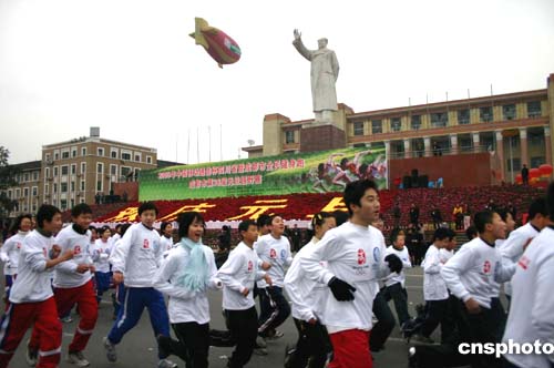 今天上午九時,在成都市中心的天府廣場上,以“祝福健康、跑向二00八”為主題的四川省暨成都市全民健身跑拉開了帷幕。在綿陽、樂山、雅安等其他七個城市,迎新年全民健身跑同時舉行。