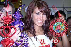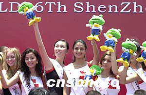 參加第十六屆世界模特小姐大賽的佳麗們五月十五日抵達深圳,展開“美麗之旅”的深圳巡游。圖為“中國結”吸引世界小姐。作者:陳文