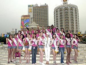 參加由澳門博彩股份有限公司承辦的“世界名模在澳門”活動(dòng)的第十六屆世界模特小姐大賽三十國(guó)冠軍佳麗十七日首次匯聚濠江,在澳門著名的葡京酒店前廣場(chǎng)合影,展示風(fēng)采。中新社記者:李剛