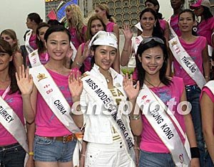 參加由澳門博彩股份有限公司承辦的“世界名模在澳門”活動(dòng)的第十六屆世界模特小姐大賽三十國(guó)冠軍佳麗十七日首次匯聚濠江,在澳門著名的葡京酒店前廣場(chǎng)展示風(fēng)采,圖為中國(guó)區(qū)冠軍馬力(左)、上屆世界冠軍延魏(中)和香港冠軍張穎向澳門致意。中新社記者:李剛