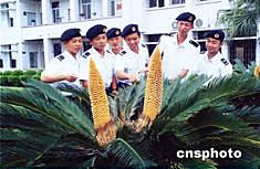 被廣東湛江評為“花園式單位”的軍港保障部隊營區內五月初出現了一道新風景:十余棵鐵樹紛紛吐出了金黃色的花蕊,其中有兩棵還開出了并蒂花。這一罕見奇葩,吸引了不少官兵前來觀賞。作者:梁利靈