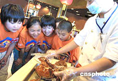 五月二十二日,北京市石景山區的百名流動人口子女參加了“我和北京在一起——六一體驗活動”。他們在北京全聚德烤鴨店品嘗了地道的北京美食。中新社記者:廖文靜