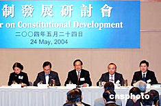 圖為[左起]律政司長梁愛詩、政務司長曾蔭權、香港嶺南大學校長陳坤耀教授、中央政策組首席顧問劉兆佳、政制事務局局長林瑞麟出席會議。作者:洪少葵