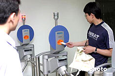 5月25日,2004年北京國際汽車展新聞發布會在北京舉行,中國國際展覽中心集團公司(中展集團)在會上宣布,今年的車展將全面啟用電子票證系統,以解決歷屆汽車展買票難、賣票現場混亂以及假票等問題。圖為參加新聞發布會的記者提前體驗電子票證系統的快捷、方便。中新社記者:盛佳鵬