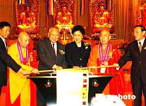 香港佛教暨各界迎請佛指舍利瞻禮祈福大會,五月二十六日在香港會展中心開幕,全國政協副主席、中共中央統戰部部長劉延東、香港特首董建華、國家宗教局局長葉小文、香港中聯辦副主任王鳳超、一誠法師、覺光法師出席啟動儀式。 作者:錢興強