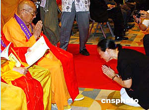 五月二十六日,在香港舉行的香港佛教暨各界迎請佛指舍利瞻禮祈福大會上,一信眾向出席開幕禮的本煥法師跪拜祈福。 作者:錢興強