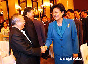 全國政協副主席、中共中央統戰部部長劉延東,5月26日在香港會見社會各界知名人士時與香港中央政策組首席顧問劉兆佳親切握手。作者:洪少葵