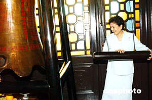 正在香港訪問的全國政協副主席、中共中央統戰部部長劉延東,五月二十七日來到香港觀宗寺參觀,在大雄寶殿敲鐘祈福。 作者:錢興強