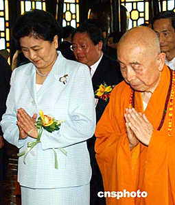 全國政協副主席、中共中央統戰部部長劉延東五月二十七日來到香港觀宗寺參觀,在大雄寶殿與覺光法師一起向釋迦牟尼佛像三味訊禮。作者:錢興強