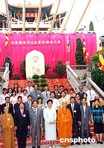 全國政協副主席、中共中央統戰部部長劉延東,五月二十七日來到香港觀宗寺參觀,圖為劉延東、國家宗教局局長葉小文、覺光法師、香港特區民政事務局局長何志平等一起在大雄寶殿前合影留念。作者:錢興強