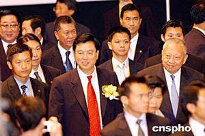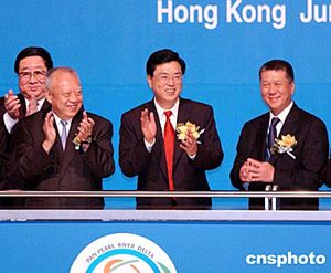 特區(qū)行政長(zhǎng)官董建華陪同中共中央政治局委員、廣東省委書記張德江等與會(huì)官員出席開幕式。作者:洪少葵
