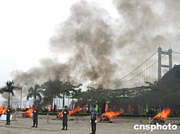 六月三日,廣東有關部門在虎門現(xiàn)場銷毀了一百六十五公斤毒品,以紀念民族英雄林則徐虎門硝煙一百六十五周年。廣東虎門現(xiàn)在是全國禁毒教育基地。作者:楊伏山