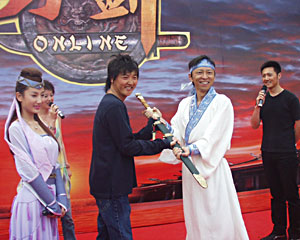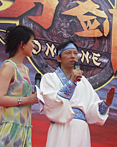 在象征著中國(guó)龍的居庸關(guān)長(zhǎng)城腳下,上千位手持搜狐“群英帖”的嘉賓匯集一堂,儼然一場(chǎng)名副其實(shí)的江湖群英會(huì)。《刀劍Online》發(fā)布會(huì)以氣勢(shì)恢弘的舞龍開場(chǎng),代表著《刀劍Online》將在群雄逐鹿的網(wǎng)游市場(chǎng),以原汁原味的中國(guó)功夫開篇中國(guó)人自己的網(wǎng)游傳奇!八押崎T人”張朝陽一身古代俠士裝扮出場(chǎng),一番刀劍揮舞,顯示了不凡的武功造詣。而作為此款網(wǎng)游主題音樂代言人的內(nèi)地著名歌手孫楠?jiǎng)t以一曲曲風(fēng)高揚(yáng),極具武俠風(fēng)格的《刀劍》將發(fā)布會(huì)氣氛推向高潮。