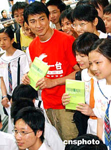 香港明星劉德華,六月五日出席九廣鐵路公司與香港電臺特別舉行的“閱讀車廂”啟程禮。圖為劉德華與學生一起參加該活動啟程禮。 作者:錢興強