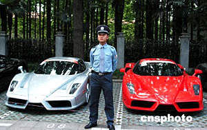 六月五日,一位保安在兩輛頂級恩佐·法拉利GT跑車前執(zhí)勤。七十多輛來自中國內(nèi)地、中國香港和日本等地的法拉利和瑪莎拉蒂跑車齊聚上海,慶祝剛剛通過國際汽聯(lián)驗收的上海國際賽車場正式啟用。作者:王麗南