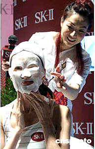 六月七日,百變天后鄭秀文在上海出任SK-II新美白天后,并在活動現場指導一名年輕女孩使用面膜的正確方式。中新社記者:廖文靜