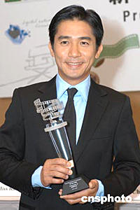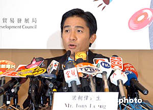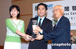 影帝梁朝偉6月8日在香港出席《第八屆香港國際影視展》新聞發布會,并獲委任為「2004年度香港影視娛樂大使」,香港貿發局影視娛樂業咨詢委員會主席鄒文懷(右),及貿發局服務業拓展總監陳嘉怡(左)攜手將紀念品贈予梁朝偉。作者:鄧慶樂