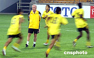 六月八日,馬來西亞足球隊在天津泰達足球場進行適應場地訓練。二零零六年世界杯足球賽亞洲區預賽中國隊對馬來西亞隊的比賽將于六月九日晚在這里舉行。圖為馬來西亞主教練哈里斯正對隊員進行現場指導。中新社記者:毛建軍