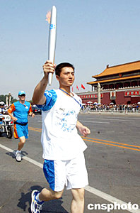 六月九日,二○○四年雅典奧運火炬北京接力活動在人民大會堂東門外廣場啟動,該火炬將經過一百四十八名火炬手傳遞五十五公里到達終點頤和園。十九歲的武警國旗護衛隊戰士阮野接過第二棒火炬從天安門前跑過。中新社記者:鄭萍萍