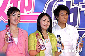 六月九日,中國內地當紅小生陳坤(右)和中央電視臺主持人趙琳(左)在北京為某飲料擔任形象代言人。作者:高遠