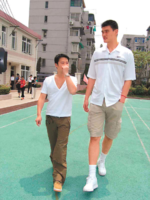 黎明和姚明首次碰頭,黎明六尺身高,本來個子已相當標準,但站在昂藏七尺五高度的姚明旁邊,黎明立即顯得矮了一截,縱使黎明踮高腳也只是到姚明的膊頭,黎明需要仰望才能跟姚明交談,結果弄得膊頭酸痛。
