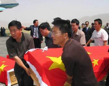 遺體由阿富汗的禮兵抬棺上專機(jī),并由阿富汗政府的公共工程部的副部長和外交部的一名司長和中鐵建派出的兩人護(hù)送靈柩回國。