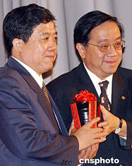 中央人民政府外交部駐香港特別行政區(qū)特派員公署特派員楊文昌,六月十五日出席香港福建中學(xué)舉行的“楊文昌特派員與你真情對(duì)話”活動(dòng),圖為該校校監(jiān)黃光漢向楊文昌贈(zèng)送紀(jì)念品。中新社記者:錢(qián)興強(qiáng)