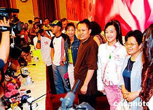 由中國著名電影明星劉曉慶(右二)加盟的電影《春花開》,6月16日日在北京人民大會堂舉行開機儀式。這部電影由中國第六代電影導演代表之一的劉冰鑒(右三)執導,他拍攝的《硯床》、《男男女女》等電影作品在海外電影節上多次獲獎。中新社記者:王麗南