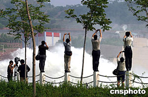 六月十九日,游客在黃河小浪底水庫出水處爭相拍照,紀錄這一激動時刻。
