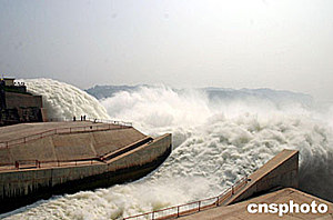 六月十九日,巨大的水柱從黃河小浪底水庫傾瀉而出。