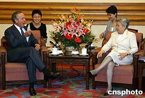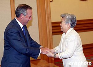 中國國務院副總理吳儀六月二十三日在北京中南海會見來訪的美國商務部長埃文斯。會談中,吳儀副總理指著自己穿的衣服和鞋子說,這些都是美國產品,也算是為縮小中美貿易逆差做貢獻,幽默的語言引來現場一片歡笑。中新社記者:毛建軍