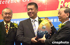 全球華商組織高峰會議,七月五日,在澳門旅游塔會展娛樂中心舉行,來自海內外華商社團及企業精英一百八十多人參加了會議,會議上世界華商組織聯盟向澳門行政長官何厚鏵贈送禮品,對他支持全球華商組織高峰會議的召開表示謝意。作者:梁永強