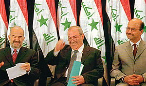代表伊拉克新政府的權力的,主要是三個方面:總統、部長會議和國民議會。伊拉克的總統很大程度是一個象征性的職位。不過,部長會議發布的法令在成為法律之前,必須得到總統和兩個副總統的一致同意。