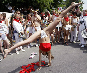 中新網7月7日電 西班牙的一群人穿著內衣反對傳統的斗牛和奔牛活動,圖為人們正看著一名女子在抗議活動中表演倒立。但恐怕他們的反對很難有結果,斗牛和奔牛是傳統節日“圣·佛明節”中最主要的活動項目,而“圣·佛明節”是西班牙三大地方節慶之一,為的是紀念西班牙潘普洛納市的守護神“圣·佛明”——西班牙每座城鎮幾乎都有一位守護神,每當到了守護神生日的這一天,當地居民就會組織一場慶典,大部分慶典中都有斗牛和奔牛項目。(固山)