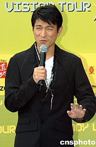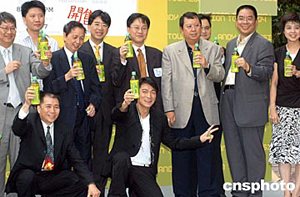 歌影紅星劉德華7月8日在香港尖沙咀星光大道舉行《道地百果園劉德華Vision Tour演唱會2004》記者會,劉德華與演唱會主辦機構高層、贊助商及各大傳媒嘉賓會上以綠茶代酒預祝演唱會舉辦成功。作者:鄧慶樂