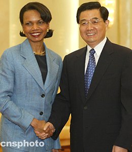 中新社北京七月九日電(記者齊彬)中國國家主席胡錦濤今天在會見到訪的美國總統(tǒng)國家安全事務助理賴斯時表示,希望美方恪守承諾,尤其要將承諾轉(zhuǎn)化為實實在在的行動,不要向臺灣當局發(fā)出錯誤信號,以免損害臺海地區(qū)的和平與穩(wěn)定。